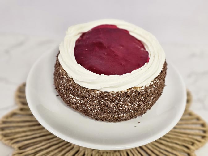 The elegant, handcrafted Gateaux features moist chocolate sponge cake layered with silky dark chocolate, filled with a vanilla cream and covered in chocolate sprinkles, topped with a sweet strawberry glaze for a show-stopping presentation. Whether your celebrating or simply treating yourself, every taste delivers deep cocoa flavour and sweetness.