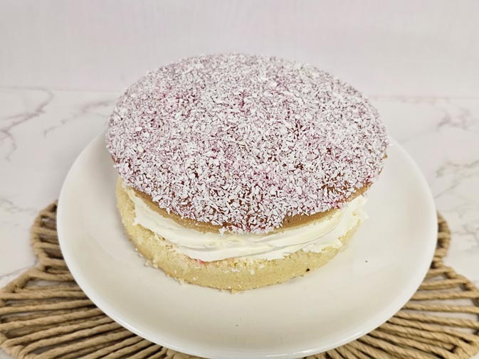 A soft and airy sponge cake with a delicate pink hue, light and sweet and irresistibly fluff. Perfectly baked and generously sized, its ideal for parties, celebrations, or simply sharing with loved ones.